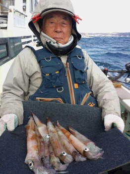途中休みがあったが、後半は水深120メートル前後を攻めて、マルイカも交じり始めた。