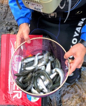 求めていた心地よい感触を体全体に感じながら、慎重に引き抜いてタモに導いた。1匹目は約19センチ、さび模様の残るきれいなアマゴ。この後は同じ縁で15〜21センチを26匹と、入れ食い状態となった。