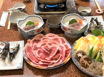 <昼食にはぼたん鍋>〇…昼食にはぼたん鍋と珍しいイワナの刺し身、アマゴの塩焼きなどを頂いた。とても甘みのある軟らかい猪肉とイワナは他では味わえない絶品といえる味で、ゆっくりと堪能した。猪肉は近くで猟師が獲り、正しい下処理を施したもので、変なくせも臭いもなく、濃厚で甘みのある軟らかさ。ビタミンB群が豊富で高たんぱく、低脂肪でカリウムなどのミネラルを多く含んでおり、美容と健康にはうってつけで、女性に喜ばれそうだ。