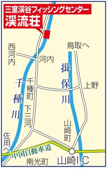 問い合わせは三室渓谷フィッシングセンター渓流荘=兵庫県宍粟市千種町河内821の1。中国自動車道山崎ICから車で50分。入川料3500円。サオやエサ、ビクのレンタルあり。(電)0790(76)2082。