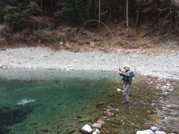 「ドナルドソン」とは米ワシントン大学のドナルドソン博士が、ニジマスの大型選抜個体と降海型のスチールヘッドを長年にわたり交配し作り出した優良血統種。実は回転寿司のトラウトサーモンはドナルドソンを海で養殖したものである。「うらたん」では井上克彦オーナーのこだわりで魚体が美しくおいしい長野県産のドナルドソンを放流しているので狙ってみたくなった。マラブーストリーマーで探りを入れると、低水温のためかリトリーブするフライへの追いがいまひとつだ。フライをゆっくりと漂わせると透明度が高く見切られてしまう。そんな時には複数のフライを使用するチェコニンフシステムが有効だ。重いニンフと軽いフライの組み合わせは思わぬ相乗効果を発揮する。重いニンフが底石に時折、引っ掛かる。それが外れた瞬間、舞い上がった軽いフライを良型トラウトがバイト。すかさず合わせると体全体をくねらせて抵抗している。重厚な引き込みを繰り返し水面でも激しく抵抗した。白銀に輝く43センチのドナルドソンだった。