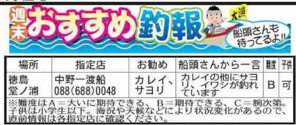 【週末おすすめ釣報】どこに釣りに行こう?と迷っている方、まずはスポニチの「週末おすすめ釣報」をご覧下さい。指定店・釣り船からの“届きたてピチピチ”情報を掲載しているので、きっとお役にたてるはず。まずは掲載のお店に1本電話してみてね!