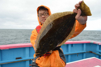 餌の生きイワシが配られると「はいどうぞ43メートルです。仕掛けは3メートルくらい上げてください」と開始の合図。 すぐにトモでヒット!調布市の大沼史門さん(26=公務員)のロッドが強烈な曲がりを見せると、良型のヒラメが顔を出す。
