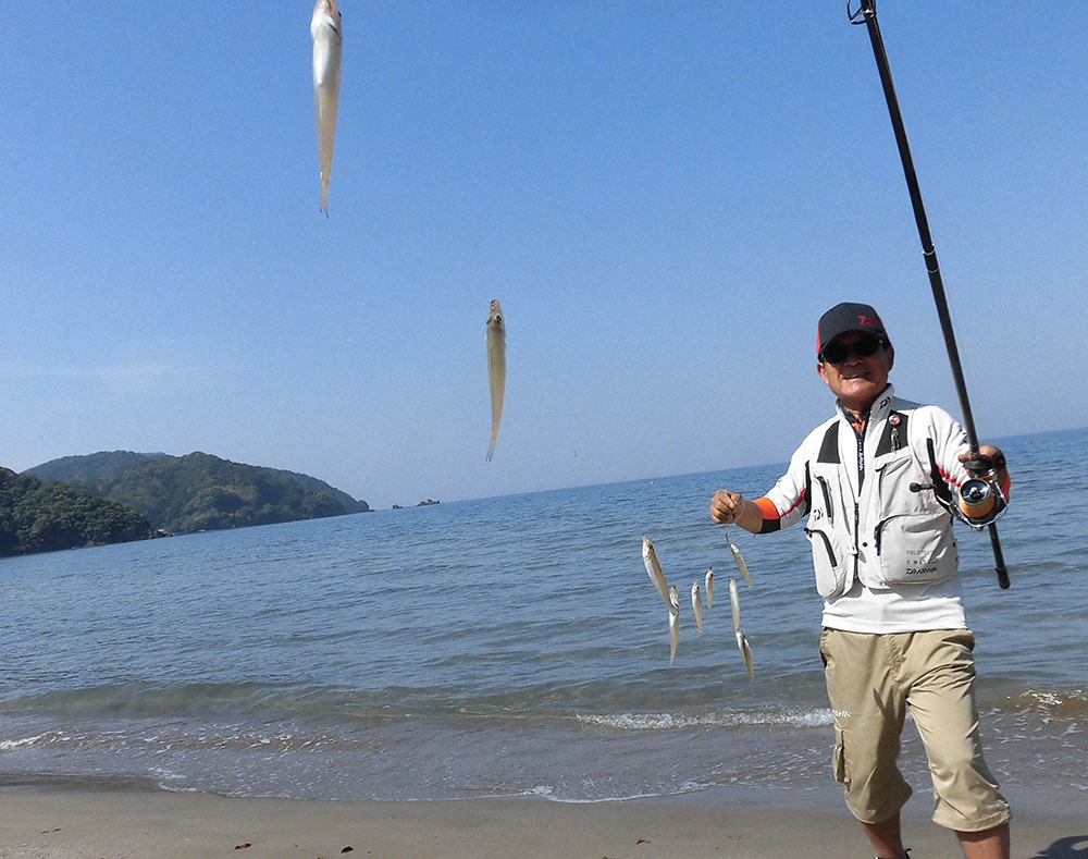 現地着は5月24日の午前6時ごろ。まずは数釣りに定評のある若宮海水浴場へ。晴天でべたなぎの好条件。朝マズメに15~20センチの型ぞろいがヒットしたものの〝モーニングサービス〟はすぐ終わった。