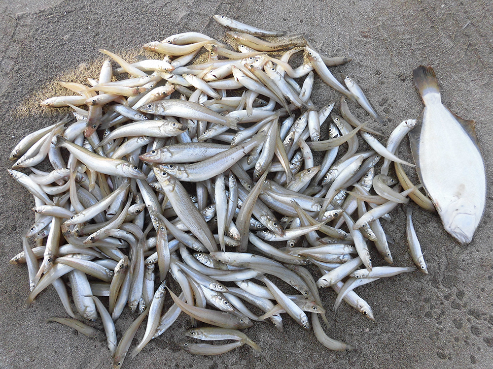 「キスは足で釣れ」と言われる通り、広い海岸を西に向かい三松海水浴場まで足を伸ばすが、小型キスやガッチョのオンパレードで意気消沈。早めに昼食を取り、過去に何度もいい目をした難波江に行ってみたところ、これが大正解だった。