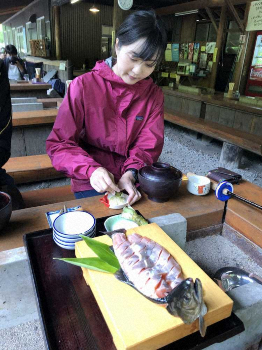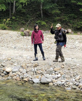 今回で渓流釣りが2回目という日光市地域振興課職員の森頌子さんに田辺さんがテンカラ釣りを熱血指導した。1時間ほどでテンカラのキャストがみるみる上達。巻き返しの流れに上手に打ち込んだ森さんの毛バリにギラリと魚が反応した。テンカラ毛バリに良型ヤマメが飛び出した。合わせが決まると予期せぬ大物は体をくねらせ激しく抵抗を見せたが、田辺さんが上手にネットイン。