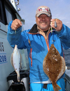 町内会の釣りクラブ7人で乗船の、本宮市・橋本万吉さん(65=自営業)は「昨日は山形県を観光、今日は船釣りです。年に1回の定番行事です」と大判カレイを連発。 電動リールをうならせていた、伊具郡・目黒良明さん(61=会社員)は「自分から掛ける感覚が強い釣りですね。誘いがうまく魚の食いと合った瞬間がたまらないです」と伝わる手応えを楽しんでいた。