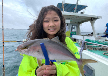 激しい雨と風の中、庄三郎丸で奮闘していたのが世田谷区の田中ひなのちゃん(12=小6)。バケ仕掛けを使った竿カッタクリでカンパチを仕留めた。