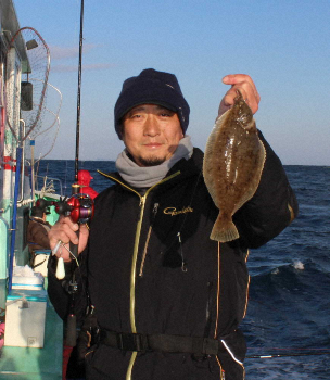 「水温の低下が遅れていましたが12度台になり、ようやくシーズン到来です。今後は徐々に釣果が上向く予想です」と話す遠藤学船長。閖上港から出船した永勝丸は航程1時間で、金華山にほど近い水深55メートルラインへ到着。仙台湾のマガレイポイントとしては最深部に相当する。