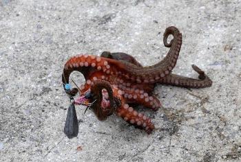 ルアー釣りも盛んで良型のサバを狙う人が多い。一方、イカの餌木を沈めてマダコを狙う人もいて、小型が中心だが数は期待できるようだ。