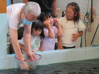 貸し竿は長さ1・2~1・5メートル。ウキ釣りで練り餌を付けて当たりがあったら鋭く合わせる。子供たちの指導をしていたのは「ボランティア」の名札をつけた品川区の黒沢康雄さん(62=自営業)。釣りは何でもござれのベテランで「生きた魚を触ったことがない子供や親も来ますよ」と話しながら、園児たちに釣らせている。