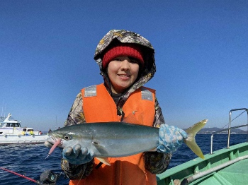 前半、ルアーで釣れなかった関根泰子さんは船に積んであったレンタル道具でビシ釣りを開始。慣れてくると平ソーダとイナダを釣りました。関根希和子さんはルアーでアジのスレ掛かり、強烈に引く平ソーダを釣ったあと後半はやはり餌釣りに。知らないうちに餌が取られているというので、マルキユー「特船オキアミ」を付けて下ろすとヒットしました。その後、吉沢さんが生かしておいた希和子さんの子アジを餌に泳がせ釣り。それでヒットしたのはやや大きい“イナワラ”と呼ばれるサイズをゲットしました。