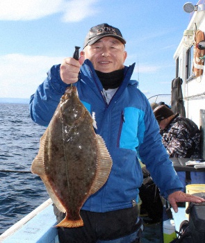 中盤まで本命の登場はなかったのだが、9時すぎに「右舷中央でヒットです!」と木村船長の声。刈田郡・我妻勇さん(52=会社員)は「ピクピクと弱い当たりがきて、突然強く引き込んだので驚きました。他のカレイとは違う手応えでしたよ」と42センチのナメタガレイに大喜びだ。