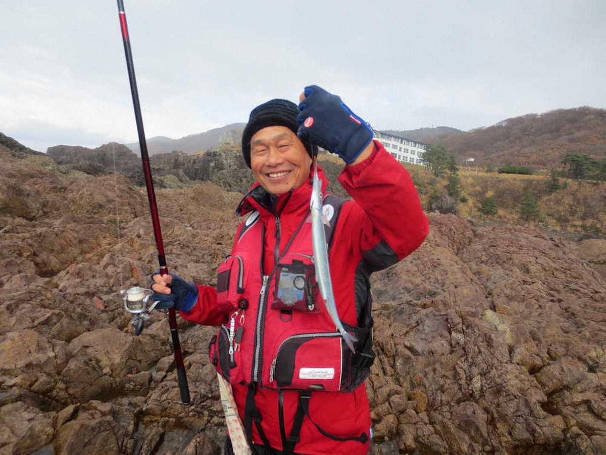 【純平の磯リポート】秋田県男鹿半島の冬の釣り物の一つにサヨリがある。加茂地区の剣崎地磯で狙った。40センチを超すジャンボサヨリが軽快にロッドを曲げてくれた。春先まで楽しむことができそうだ。(スポニチAPC・小林 純平)