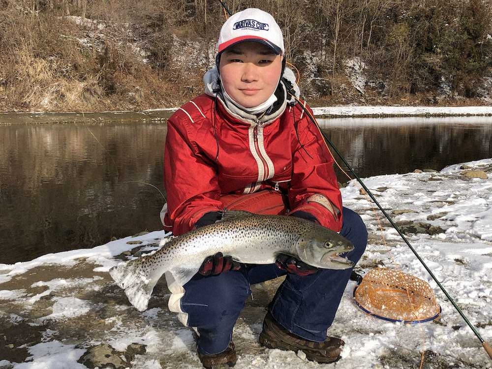 寒さ吹き飛ぶ美しいハコスチ 半分凍った川に品種改良ニジマス