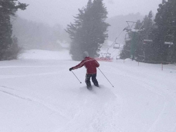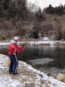この日の気温は日中でもマイナスの真冬日。あまりに寒いのでスキーウエアのままで釣りを開始した。釣り人が少ないため魚は安心して岸寄りに付いている。ロールキャストで静かに狙うとヒレピンの美しいブルックトラウトやイワナがヒットし丁寧にリリースする。時折、小雪が舞う天候だが、イワナ系の魚は活性が高く楽しめた。しかし、だんだんと、思うようなキャストが決まらなくなってきた。