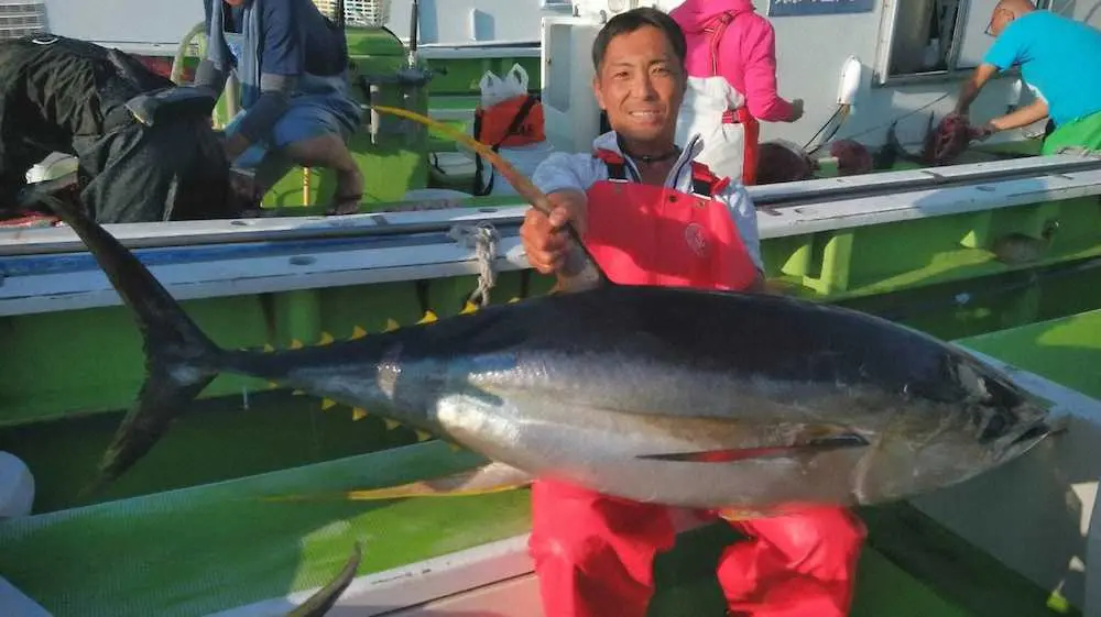 弧を描く竿を握るのは、三郷市の小船哲史さん(42=建築業)でキャリア15年の常連さん。昨年は47・6キロを筆頭に5匹。そして今季は今4匹目と格闘中。ファーストランは90メートル。セカンドで190メートル走られた。身長1メートル65、体重58キロの小柄な小船さんだが「昨年の大物以上ありそう」と、強い引きに耐えている。25分後、船長を含めて4人掛かりで取り込んだキハダは、全長150センチ、49・6キロのモンスターだった。後半、左舷胴の間で48・3、28・5キロを追加して15人でキハダ4匹、キメジ1匹と上々の成果。この日、2隻でキハダのヒットは22回。「反応が出ると30分以上切れず、出っ放しだったね」とは山本船長。今季も「釣れる間は狙う」構えだ。