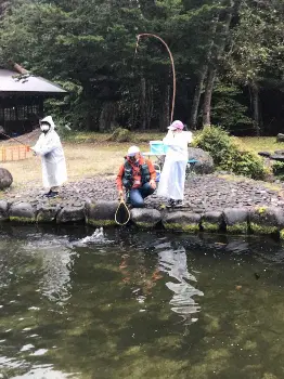 スクールの生徒さんは小学生2人を含むフライ初挑戦の5人。周囲に植栽があり庭園の池のようなポンドだが、流れ込みが2カ所ありドライフライへの反応も良い。活性の高い流れの魚をめがけてキャスト開始。水が澄んでいて魚の口にフライが消えるのがよく見えるのだが、タイミングが合わない。初心者にとって合わせはなかなか難しい。それでも元気な小学2年生の布野喜一郎君は、自作のフライで良型のトラウトをヒット。思った以上の重量感にロッドは満月に。トラウトの力強いファイトに負けず、見事釣り上げた37センチの美しいレインボートラウトに大喜びだ。