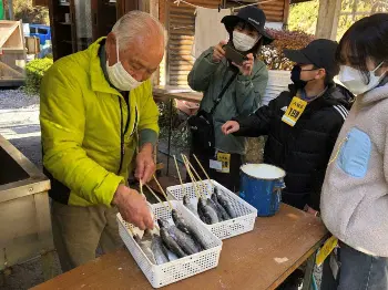 参加者全員がニジマスを釣り上げ、キープした魚を釣り場のスタッフに内臓を取り、串刺しにしてもらった。今回は自分たちで焼いたが、無料で炭火焼きにしてもらうこともできる。自分で釣り上げた魚を遠火の強火で焼き上げた味は格別。充実した釣りの旅になること請け合いだ。ただし、このサービスは午後2時までに受付に魚を持ち込む必要があるので注意しよう。