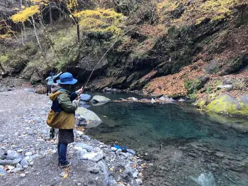 入間川の源流の一つ有間川。名栗湖より上流にはクマタカやヤマセミが棲息し、民家が一切ない渓谷だ。川沿いの足場がよく整備されており、渓流釣りを楽しみたいグループやファミリーに人気。川岸には屋根のあるバーベキュー施設がありデイキャンプ気分を楽しめる。