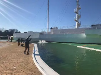 土曜日の昼すぎに筆者は長男の知来とフライで釣行。キャストを始める前に周囲の釣り人に「ここで釣っても良いですか?」と一声掛けてから流水プールの南岸に入った。流水プールの中央には水上公園のシンボルである帆船のオブジェ「はつかり丸」がある。そのおかげで必ず風裏ができ、日中にはユスリカもハッチするため水面への注目度が高くなるのだ。白いドライフライをキャストすると、ほどなく25センチ級のレインボートラウトが連続ヒットし一安心。しばらくすると隣に「全く当たりがない」というルアー釣りの親子がやって来た。苦戦する小学生に川越公園のスタッフが釣り方を優しくアドバイス。時には魚の活性を上げる目的でスタッフがペレットを投入。そのかいあって小学生の男の子はルアーで初ヒットし、大喜びだった。