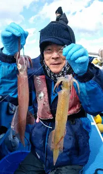 ◯…数日前に60匹で竿頭を飾った埼玉県白岡市の鳴海美津正さん(75)と乗り合わせた。この日は13匹でストップ。「当日はサバが活発。そんな時ほどイカも乗りが良いですね」。仕掛けは3×5号で、Wカンナ(ハリ)の8本ヅノ。退院後の病み上がりから、大きく誘わずに置き竿での快挙だった。