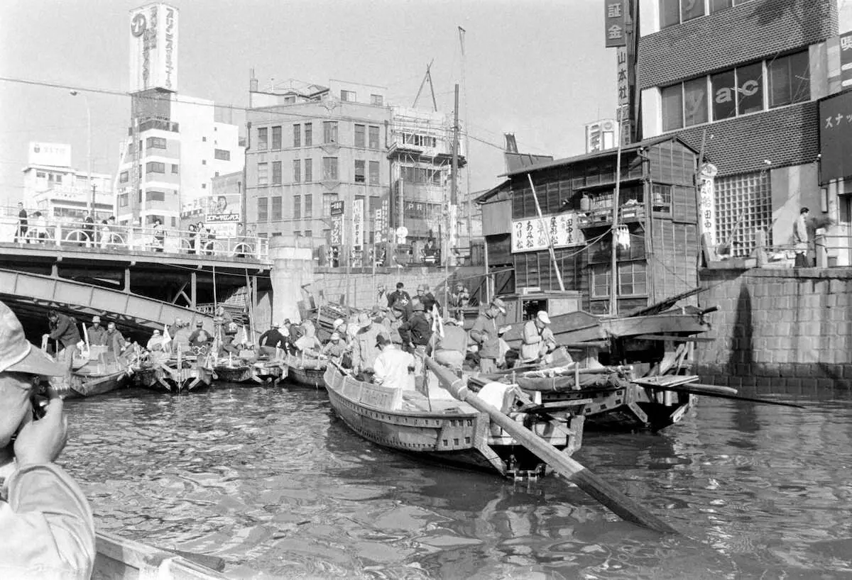 【思い出写真館】1965年(昭40)11月、東京・浅草橋の風景。今まさに河岸払いしようとしている落ちハゼを狙う釣り舟だ。別の写真では船宿のはっぴを着た船頭さんの後ろ姿もあった。情趣豊かな晩秋の風物詩だったのだろう。