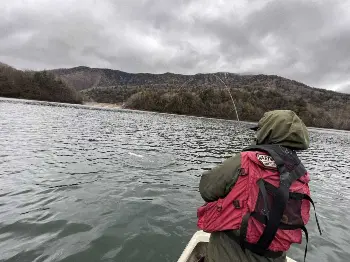 かなりの大物だったのでガックリ。その後は全く当たりがないままダムサイト方向に移動したが、ベイトのワカサギは確認できなかった。だんだんと風雨で指先が冷えて、家内のキャストがままならなくなる。仕方なくラインを出したまま風下のダムサイトに移動。そこで彼女は目立つビーズヘッドフライをやめて、コパーワイヤの地味なフライに交換し渾身(こんしん)のフルキャスト。ラインが十分に沈んでから私が風上に向かってこぎ出すと、対角にボートが見えた。衝突しないように少し転進した直後に家内のリールがうなりを上げた。最初の走りをいなしてから、彼女は2度追い合わせを入れる。また走り始めた魚は、リールのドラグをものともせずグングンとラインを引き出すつわものだ。10分ほどのリールファイトの末、やっと姿を見せた大物はその口からワカサギを数匹吐いた。ネットに入ったのは、これぞ越年物という白銀のレインボートラウト60センチだった。ロッドはVARIVASパワートレイル#6、リーダーは同スティルウォーターFHT3Xを使用した。悪天候時には、ボートでフライを引っ張るハーリングは良い戦術だ。あなただけの新たなポイントを見つけるのに役立つことだろう。