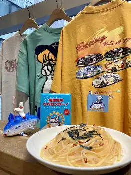 カラフルなTシャツやジーンズ、ベルトなどのファッション小物類がズラリ…。アメリカン・カジュアルを中心に取り扱う「FREAK’S STORE(フリークスストア)」の一角に置かれたブルーの箱が目に留まった。「可愛い」と感じた箱に書かれているのは、ビンテージ風のカツオにまたがったシェフの姿。ポップな字体のアーチ形ロゴを読むと「焼津鰹(やいづがつお)のペペロンチーノ」。これが噂のパスタソースか!