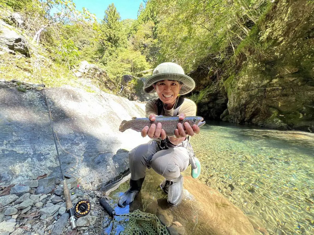 しばらくして2人に20センチほどのアベレージサイズがヒット。爆釣かと思いきや後が続かない。渓谷の流れはとても澄んでいて、トラウトがフライを見切ってUターンすることが少なくない。難しい状況の中で魚をヒットさせるには、最初の1投目が重要になる。ところが絶好のポイントで村野さんは投げづらそうにしている。筆者はその理由に気が付いた。彼女は左利きで、右利きの筆者とは狙いやすいポジションが異なるのだ。一方、多くの人とは違ったポイントにフライを届けることができるという利点でもある。その後、村野さんは40センチの良型ニジマスを釣り上げてリリース。サウスポーならではのフライの流し方を工夫してのヒットだった。