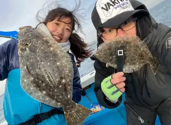 今回の同行者は、以前スポニチ主催の釣り大会でボクが表彰式のMCをやった直後、逆ナンしてきた釣りガール・かずみチャン。東京・羽田のガイド船の受付を担当している船長候補生でもあるので「これは仲良くなっといて損はない」と、イヤらしいことを考えて誘いました。午前4時半の冷え込む港に現れたかずみチャンから「私もヒラメ釣り初めて。どうせなら勝負しましょう。負けた方が昼食おごりで」と挑まれた。望むところ。2人でタックルをレンタルして清栄丸に乗船した。