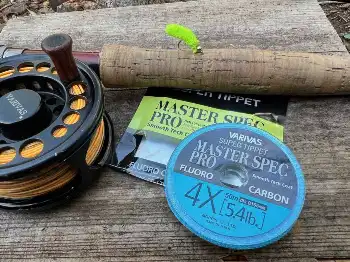 午後は小菅フィッシングヴィレッジで実釣講習を開始。1500円とお得なC&R4時間券を購入した。水は冷たく簡単にフライに飛びつく魚はいない。小雪の舞う中で、飯塚さんは奇跡を起こす。黄緑色のニンフに替えて数投目。気が付けば彼女のロッドが、満月のように大きく弧を描いていた。グングンと左右に首を振るファイトは、まぎれもなく大物だ。不安になる筆者を横目に、彼女は無理をせずに上手に魚を岸に寄せていく。ネットに収まったのは52センチの大物ニジマス。飯塚さんは満面の笑み。フライ初の魚が50センチアップとは驚くしかない。魚はブナムシニンフをガップリと食っていた。ティペットはフロロのVARIVAS「マスタースペックプロ」4Xを使用。彼女は午後4時過ぎにも50センチの大物をキャッチ。単なるビギナーズラックではないことを証明した。