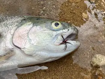 ひょっとして小魚を食べているのかと思いストリーマーを引いてみてもダメ。キャストするのがつらくなってしまい、テンカラ毛バリのようなソフトハックルを漂わせておくことにした。水面下にあるフライの糸フケを取るためラインを手繰ると、水面下でギラリと銀色の反射光。そのまま湖底に引き込まれそうな勢いでラインが出ていく。何度もジャンプして果敢に走るファイトはスチールヘッド系ニジマスの証。なんとか足場の良い場所まで誘導したところをランディング。