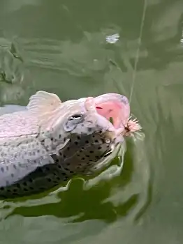 まずは管釣り定番のオリーブ色のニンフをキャストすると、リーダーにすぐに反応があり20センチ級のニジマスが連続ヒットしたが、3匹も釣るとパタリと当たりが止まってしまった。フライをクリーム色に替えるとまた同サイズが数匹ヒット。目の前に大きなアルビノマスが見えたが当たりはなし。