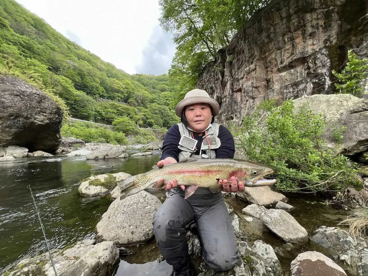 ユーチューバーかなぱん 緑色スプーンで食べごろニジマス25センチ「奇跡の一匹でした」