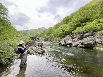 魚影を確認するつもりで早速、入山沢C&Rへ。雨後でやや増水していたが、ポイントごとに魚がフライに反応してくれた。生徒の吉岡成味さんは、ドライフライで美しいヤマメを釣り上げ大喜び。魚影はかなり濃い印象だったが、釣り人が増えてきたので河原が広い川治温泉に移動することにした。