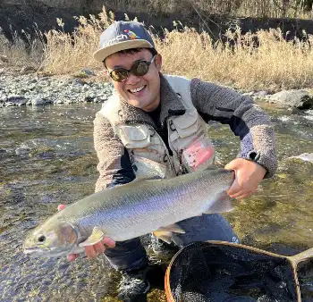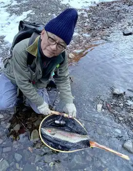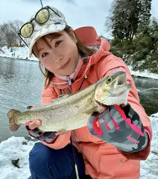 寒さ吹き飛ぶ美しいハコスチ 半分凍った川に品種改良ニジマス