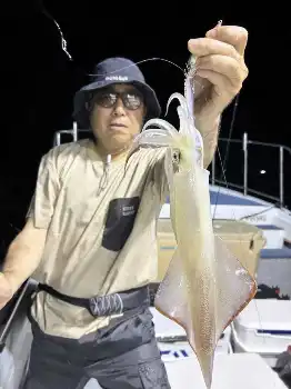 辺りもすっかり暗くなり集魚灯の明かりが効きだしたタイミングで、私に本日のファーストヒット。35メートル付近でフッとラインのテンションが抜け、ギュンッ、ギュンッと小気味よいジェット噴射が始まった。キャッチしたのは、胴長が20センチ程度のケンサキイカ。身が柔らかく、食べても美味な大本命。