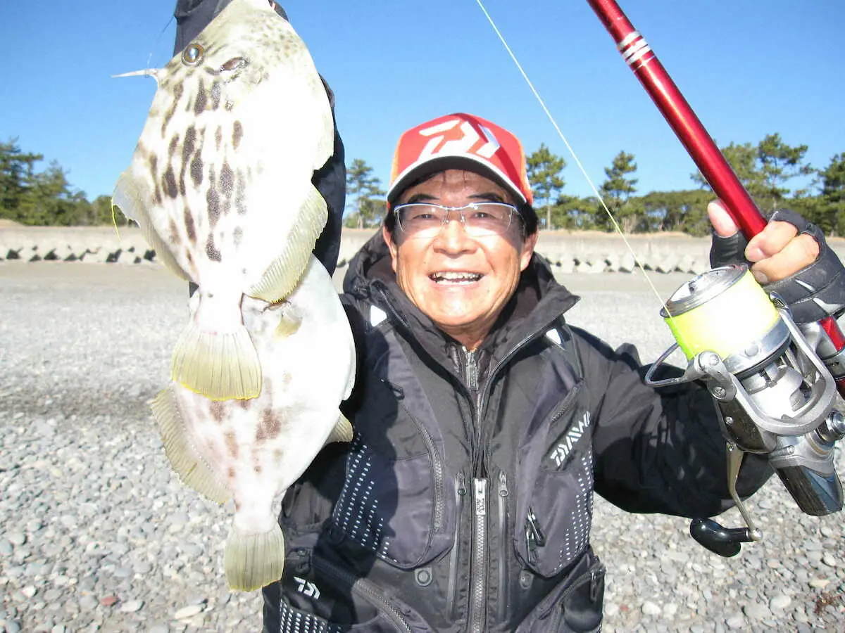 寒波で冷え込みが続くと、関西近郊では投げ釣りの対象魚が少なくなってきた。そこで、厳寒期でもカワハギが狙える貴重なエリアである徳島県海陽町の大里松原海岸に1月中旬に釣行。早朝は氷点下まで気温が下がり、全く反応がなかったが、気温が上がった午前10時過ぎに待望のカワハギがヒット。昼前には25センチの良型がダブルヒットし厳しい中でも7匹も釣れ、幸先の良いスタートを切ることができた。 (スポニチAPC・松尾 幸浩)