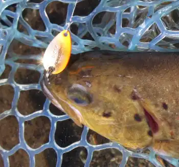 「食い付け、食い付け…」。心の中で念じながらルアーを泳がせるも、ヒットするまでには至りません。そこで発想を転換。オレンジ×ゴールドの派手めなスプーンをキャストし、魚の背後から少し早めに巻いてくると、魚が反射的にバイト。手元にグンッとした衝撃が伝わります。
