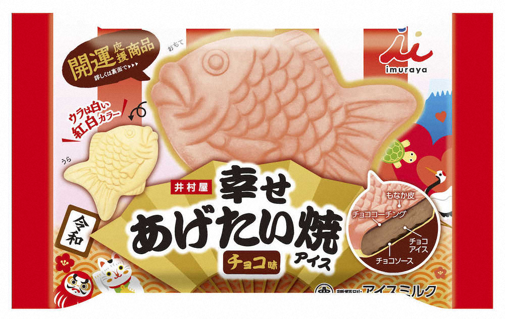 井村屋(津市)は、アイスの新商品「幸せあげたい焼アイス」を発売した。タイの形のもなかは表がピンク、裏が白の紅白カラーで、中にチョコレートアイスやチョコソースを入れた。受験勉強や家事を頑張る人に届けたいと、3月末までの期間限定で販売。希望小売価格は151円。問い合わせは通話無料のお客様相談ルーム、電話(0120)756168。