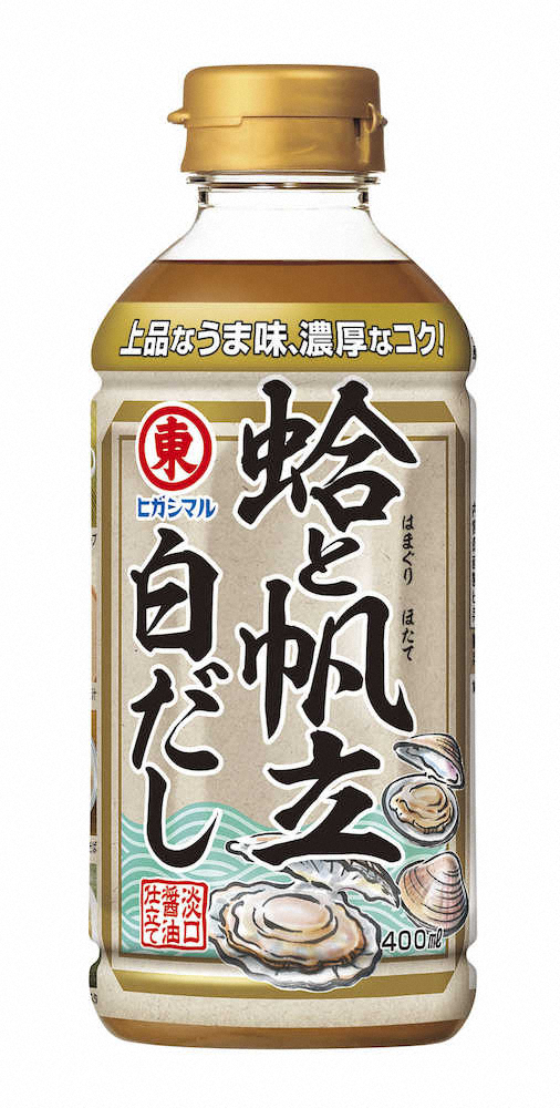ヒガシマル醤油(兵庫県たつの市)はハマグリのうま味とホタテのコクを合わせただし「蛤と帆立白だし」を発売した。