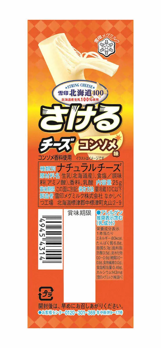 コンソメ味の裂けるチーズ 雪印メグミルクの「雪印北海道100 さけるチーズ コンソメ味」