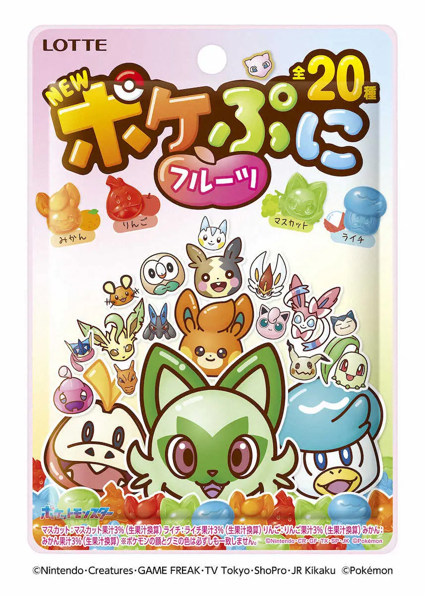 20種類のポケモンの顔をかたどった小さなサイズのグミで、ミカン、リンゴ、マスカット、ライチの4種類を味わえる。