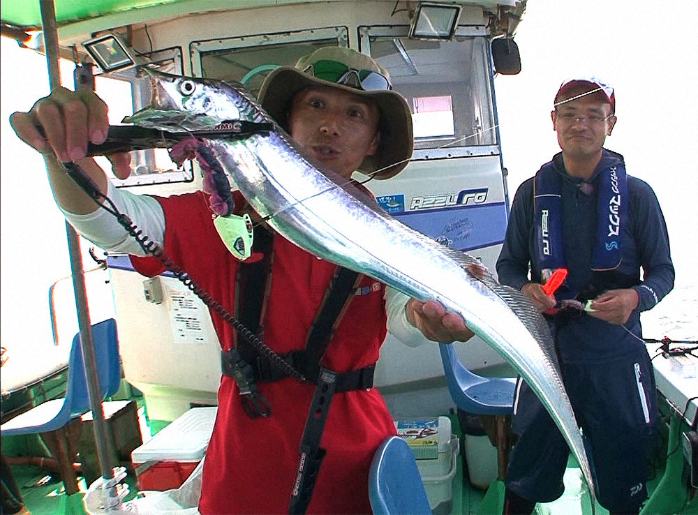 釣り人待望のターゲット、タチウオを求め、早朝5時半に大阪府泉佐野市の食品コンビナートから出船。約30分でポイントに到着。釣り方はタチウオのテンヤ釣りで、重りと掛け針が一体となった「タチウオテンヤ」という漁具に、冷凍のイワシやサンマの切り身を巻き付け、タナを探りながらアクションで誘う。幸先よく1投目から指4本分のタチウオを釣り上げた。関西ではタチウオのサイズは体の幅を大人の指に換算して測るのが一般的で、指4本以上は大物クラスといわれる。この日は絶好調で指3本から4本クラスを次々とゲット。テンヤのほかにもメタルジグも順調で〝ドラゴン級〟ともいわれる体長1メートルを超えるクラスも姿を見せた。