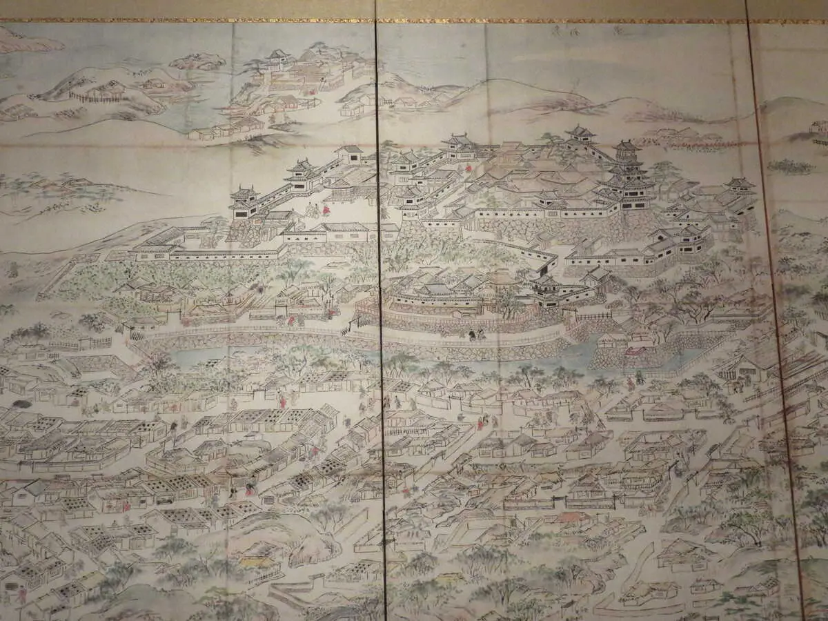 名護屋城博物館に展示された屏風絵のレプリカ。上右手に5重7階の天守が描かれている