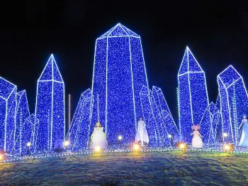 イルミリオンの今年の目玉は、劇場版「美少女戦士セーラームーンEternal」の世界観を再現した新エリア「美少女戦士セーラームーン イルミネーション―Eternal―」。広さ45万坪のさがみ湖リゾートプレジャーフォレストの丘陵地(標高約350メートル)がその舞台で、作中に登場する30世紀の東京を描いたクリスタル・トーキョーを再現した「クリスタル…」前にセーラープリンセスらが勢ぞろい。暗闇に輝く白、青、ピンクなどの色鮮やかな光と大音量の音楽が連動したショーは迫力満点。思わず体が動き出してしまうほどだ。