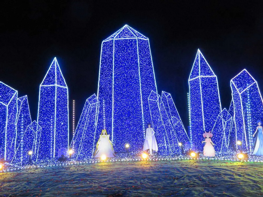 ♪ゴメンね素直じゃなくて 夢の中なら云える…夕暮れ時、「さがみ湖イルミリオン」のメーンエリア「クリスタル・トーキョー」で、美少女戦士セーラームーンのイルミネーションショーが楽曲「ムーンライト伝説―ZZver.」に乗って始まった。