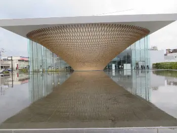富士山が世界遺産に登録されたのを記念して17年に総工費約41億円で建設された施設で、中央の展示棟は県産ヒノキを用いた木格子による逆円錐形のユニークなデザイン。正面から見ると“逆さ富士”の形をしており、前面の約2300平方メートルにわたって富士山の湧水が張られた水盤に映る姿は“正富士”に見えるのだ。