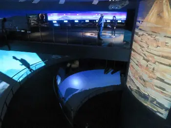 早速、スロープを上り始めると、壁面にまず海から見える富士山が現れる。次いで平地、富士山五合目、森林限界、山頂と標高が上がっていき、最後は山頂からの風景の映像。登山道や山中から見下ろした町の夜景、太陽の御来光などを登山者の目線で見ることができる上、雲の湧き出る様子や登山者のシルエット、さらに鳥の鳴き声や登山靴で地面を踏みしめる音など音の演出も加わり、臨場感たっぷり。十数年前に実体験した富士登山を思い出す。